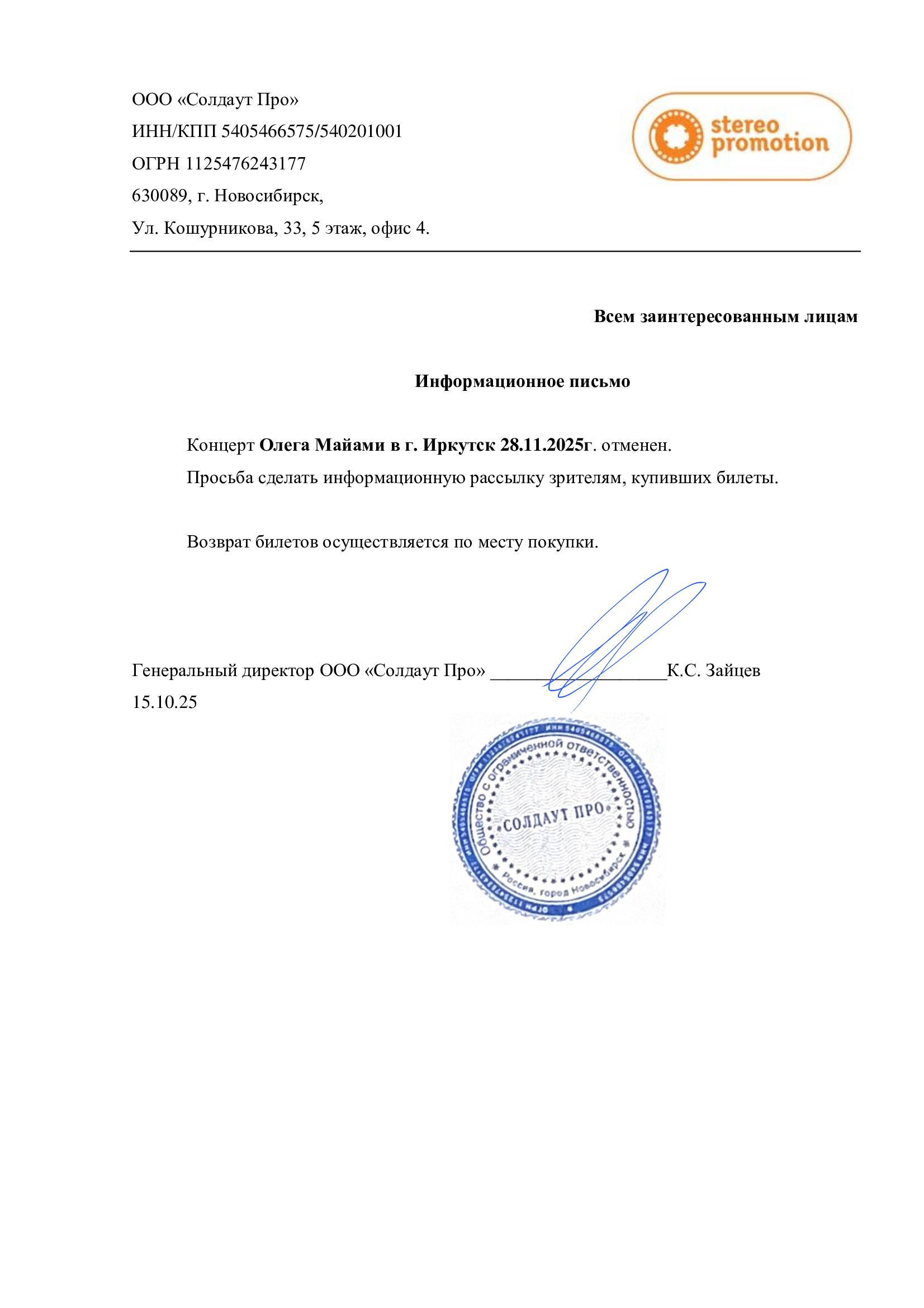 2025-12-08 14:25:00 Концерт Олега Майами / г. Иркутск