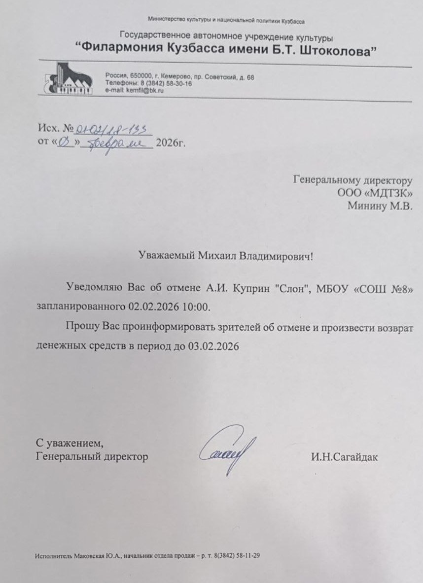 Спешим сообщить, что по информации, полученной от организатора, спектакль «А.И. Куприн «Слон», запланированный на 2 февраля 2026 года в 10:00 в Средней школе 8 (г. Кемерово), отменён.
