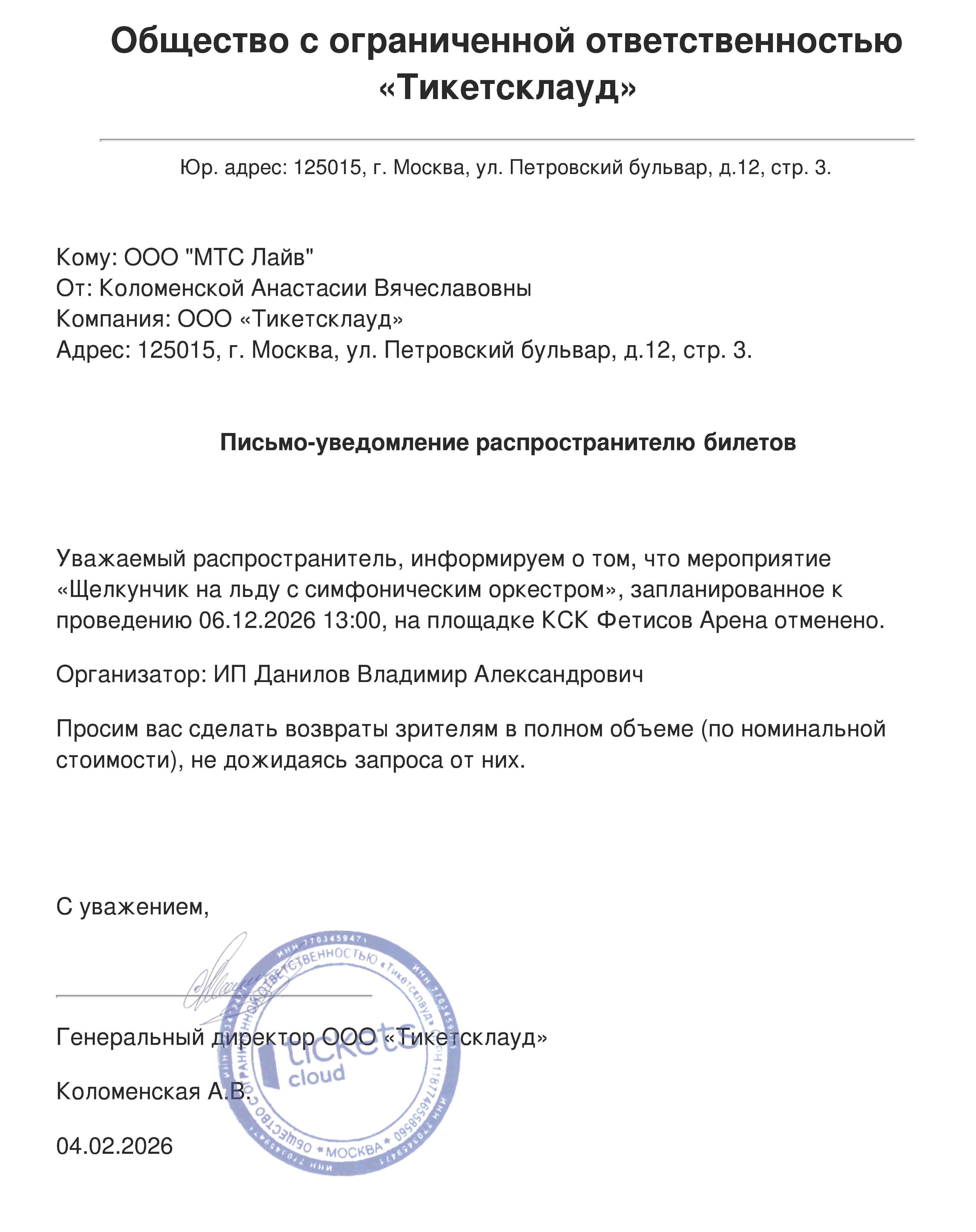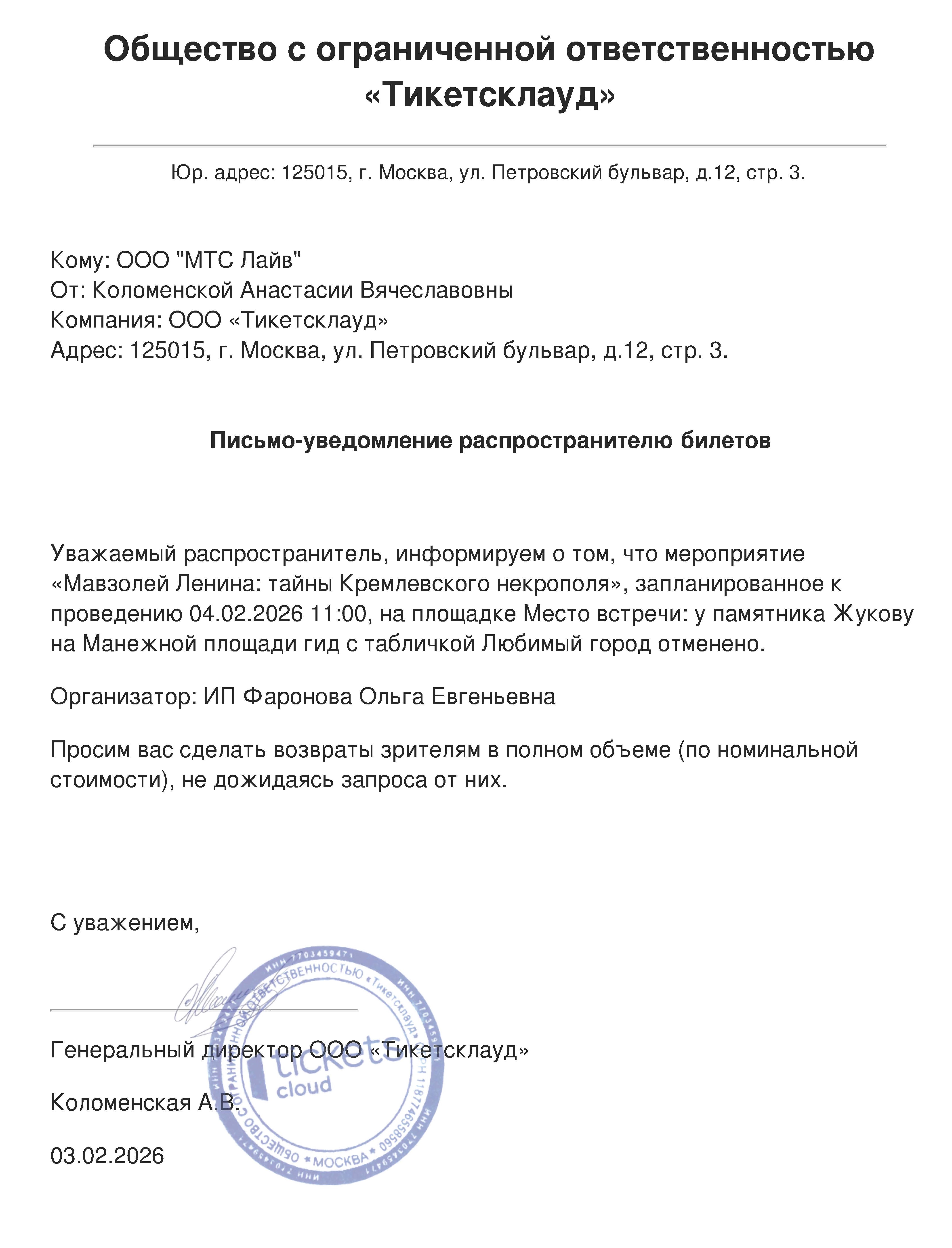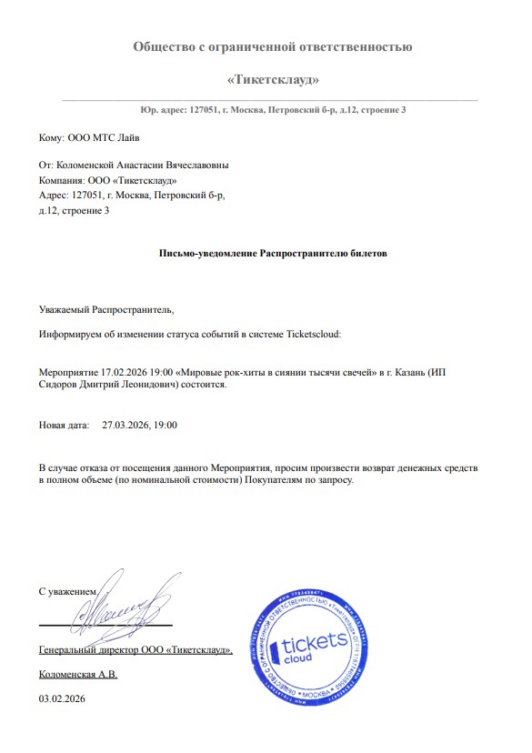 О новой дате мероприятия и об условиях возврата будет направлено дополнительно.