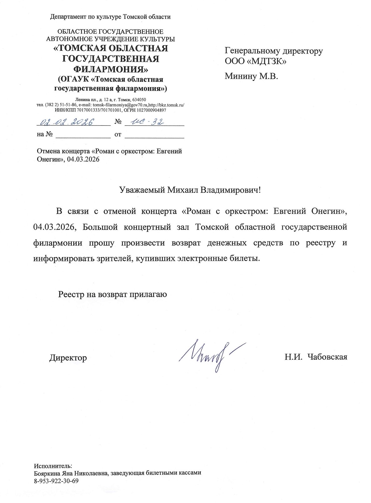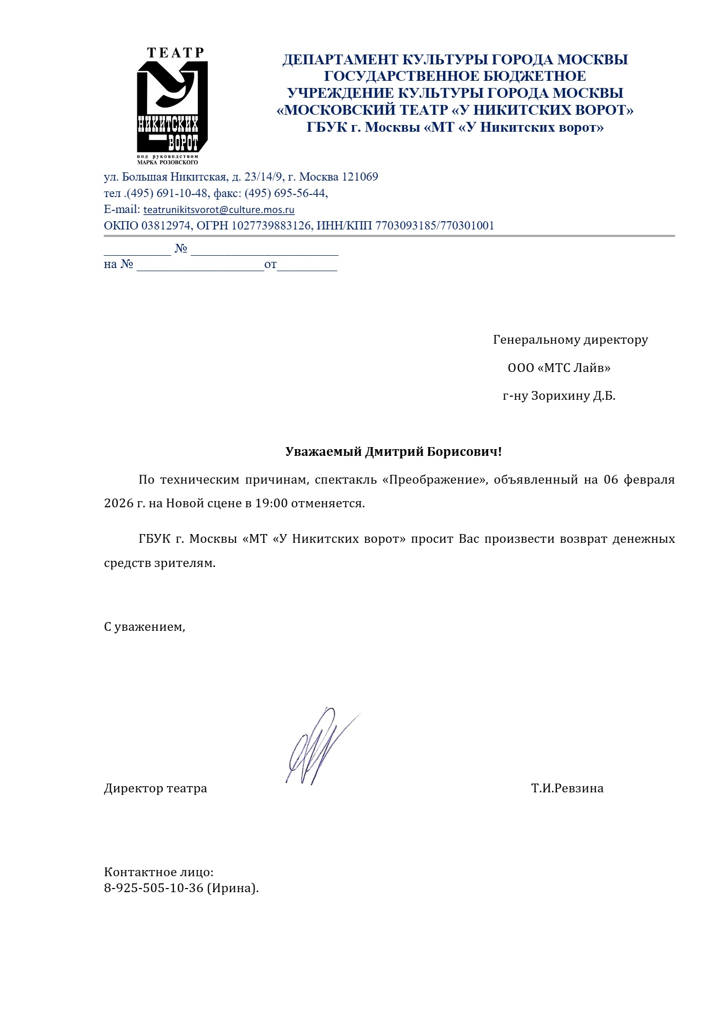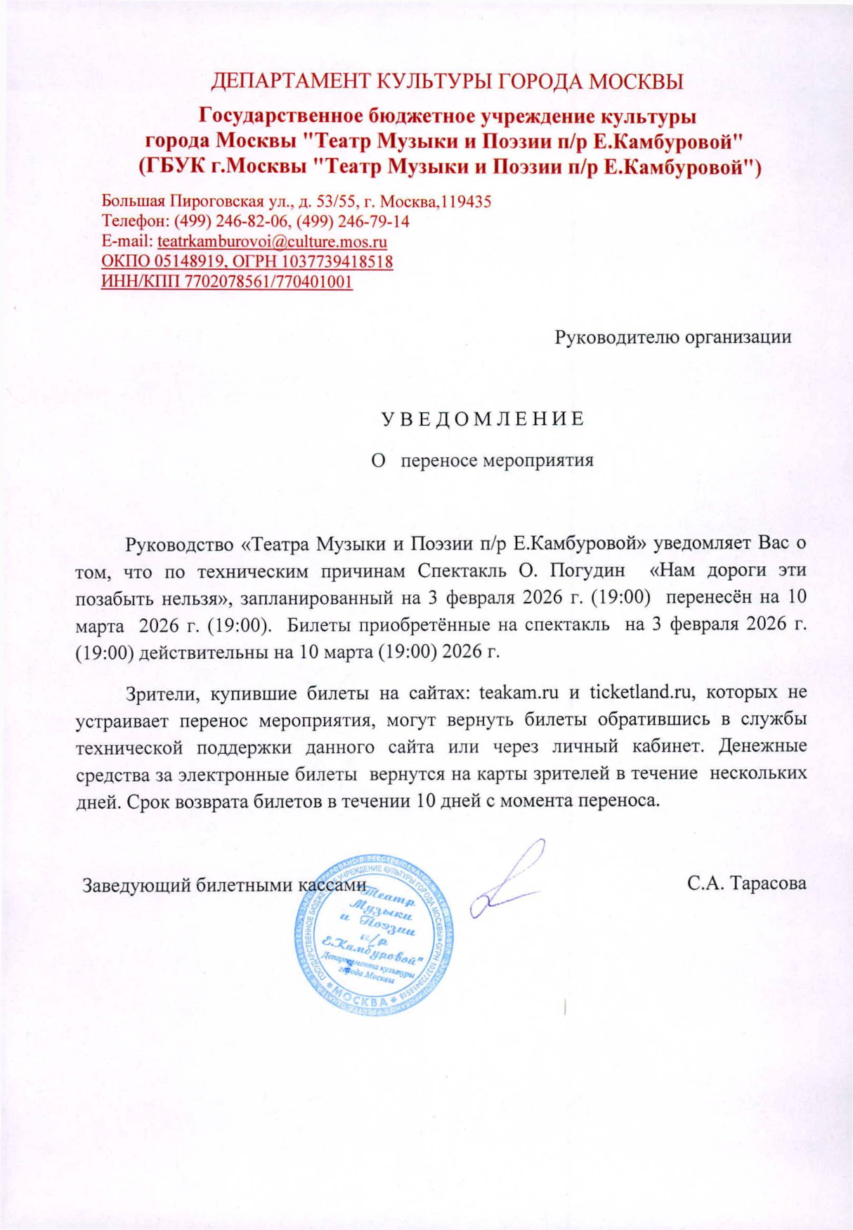 О новой дате мероприятия и об условиях возврата будет направлено дополнительно.