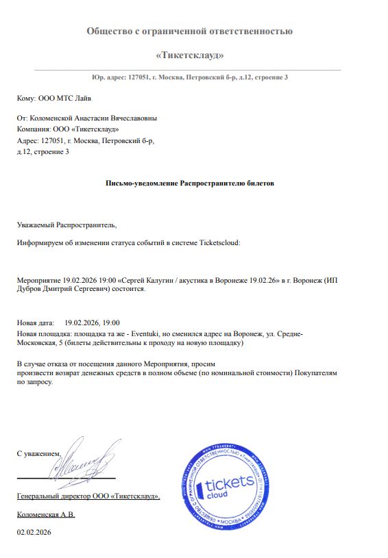 В случае, если третье лицо (правообладатель или уполномоченное им лицо) считает, что его права на объект интеллектуальной собственности нарушаются, он может направить претензию по адресу: 109147, г. Москва, вн.тер.г. муниципальный округ Таганский, ул. Воронцовская, д. 1/3, стр. 2А и по e-mail: support@ticketland.ru.
