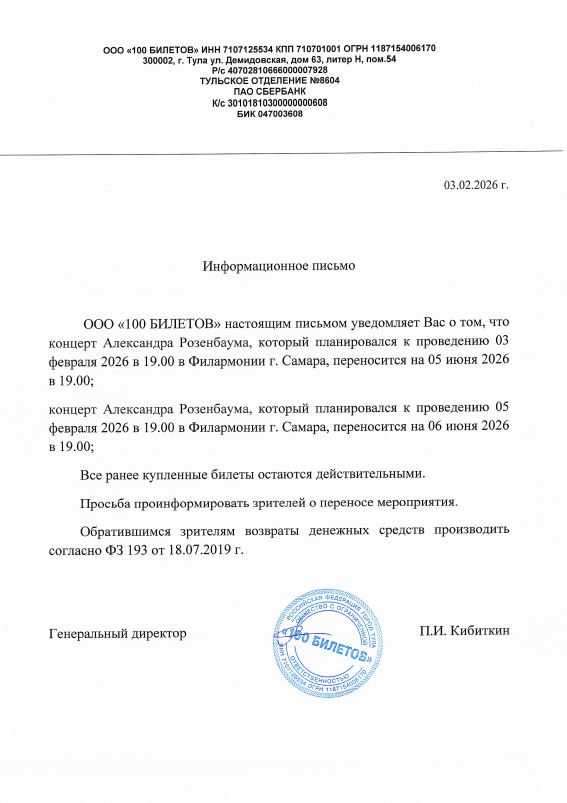 Спешим сообщить, что по информации, полученной от организатора, концерт Александра Розенбаума, запланированный на 3 февраля 2026 года в 19:00 в Самарской государственной филармонии, перенесен на 5 июня 2026 года, начало в 19:00.