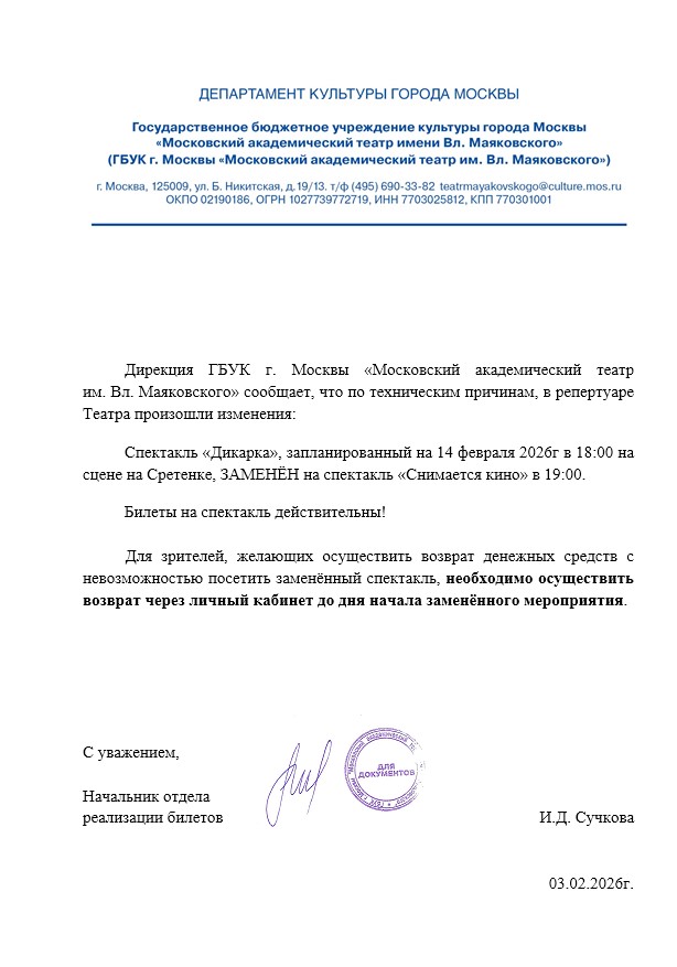 Спешим сообщить, что по информации, полученной от организатора, спектакль «Дикарка», запланированный на 14 февраля 2026 года в 18:00 на в театре Маяковского (сцена на Сретенке), заменён на спектакль «Снимается кино». Начала замененного спектакля в 19:00.