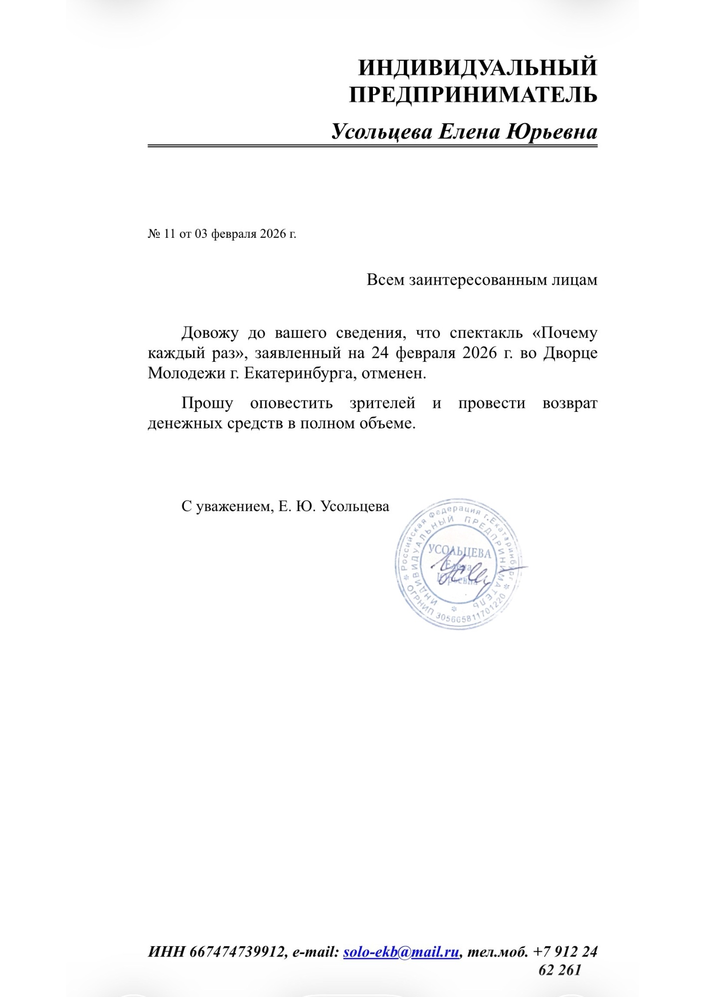 Спешим сообщить, что по информации, полученной от организатора, спектакль «Почему каждый раз...», запланированный на 24 февраля 2026 года в 19:00 во Дворце молодёжи (Екатеринбург), отменён.