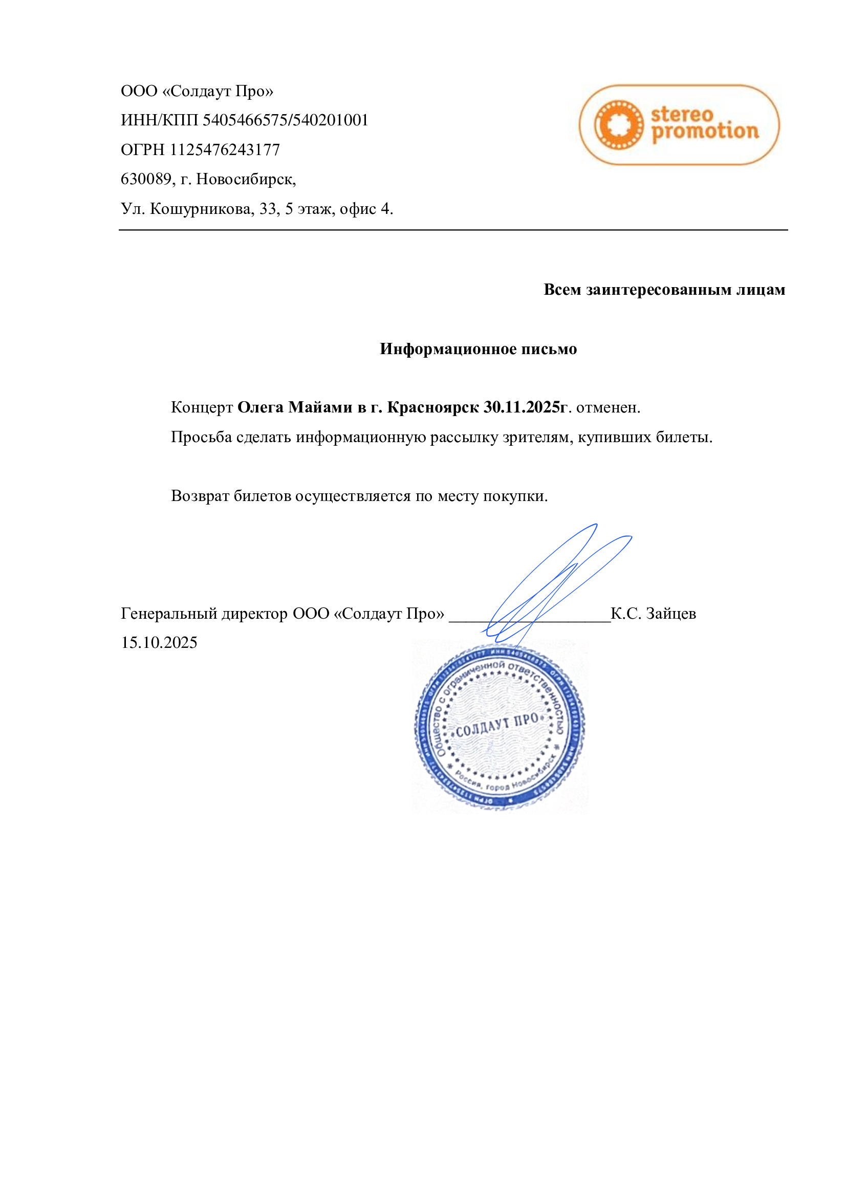 Уважаемый клиент! Спешим сообщить, что по информации, полученной от организатора, концерт Олега Майами, запланированный на 30 ноября 2025 года в 20:00 в Circus Concert Hall, отменён. Деньги за электронные билеты вернутся автоматически в полном объёме на карту, с которой была произведена оплата. Если вы купили билет в кассе Ticketland.ru за наличный расчет, то обратитесь, пожалуйста, на почту: vozvrat@ticketland.ru. С уважением, команда поддержки Ticketland.