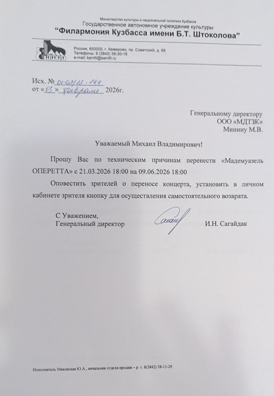 Спешим сообщить, что по информации, полученной от организатора, концерт «Мадемуазель Оперетта», запланированный на 21 марта 2026 года в 18:00 в Филармонии Кузбасса, перенесён на 9 июня 2026 года, начало в 18:00.