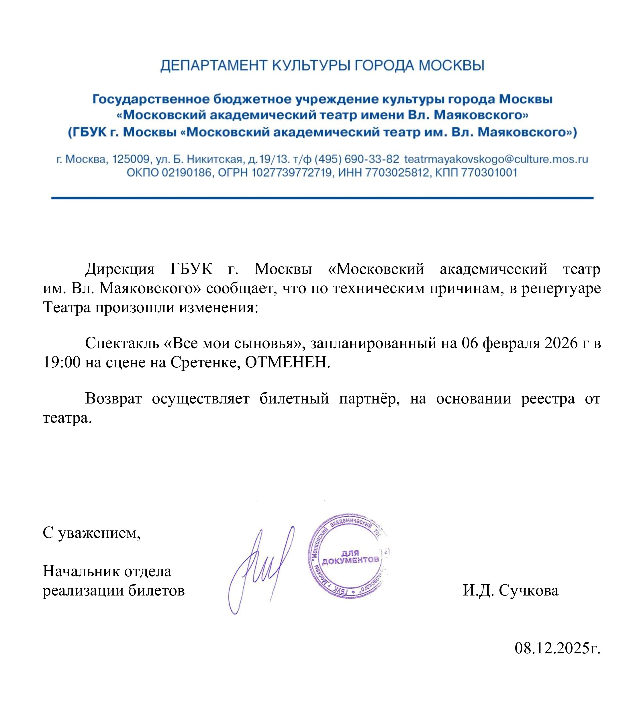 Уважаемый клиент! Спешим сообщить, что по информации, полученной от организатора, cпектакль «Все мои сыновья», запланированный на 6 февраля 2026 года в 19:00 в Театре им. Вл. Маяковского (сцена на Сретенке), отменён. Деньги за электронные билеты вернутся автоматически в полном объёме на карту, с которой была произведена оплата. Если вы купили билет в кассе Ticketland.ru за наличный расчет, то обратитесь, пожалуйста, на почту: vozvrat@ticketland.ru. С уважением, команда поддержки Ticketland.