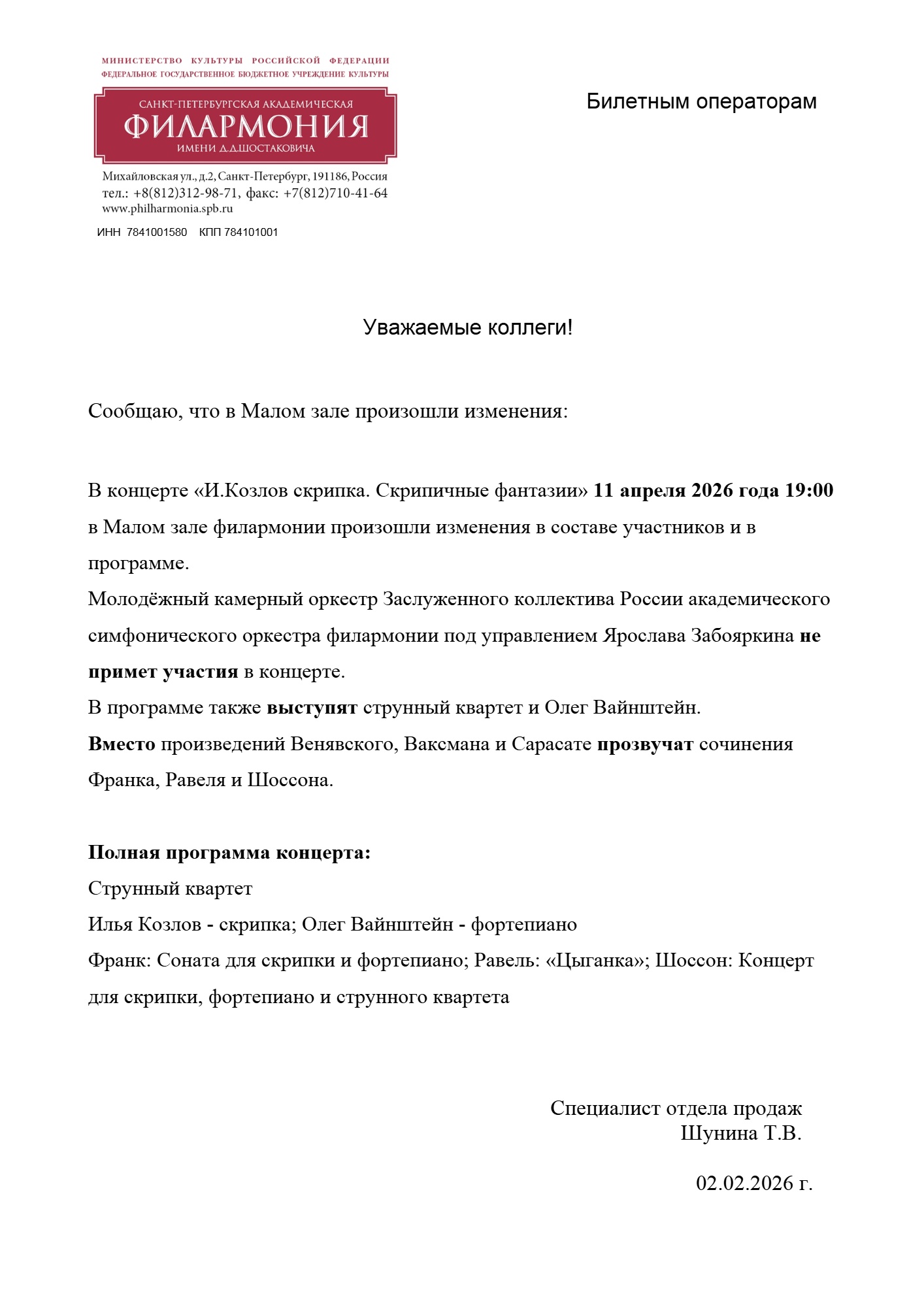 Спешим сообщить, что по информации, полученной от организатора, у концерта «И. Козлов скрипка. Скрипичные фантазии. аб-т № 12», запланированного на 11 апреля 2026 года, в 19:00 в филармонии, заменен состав участников и программа мероприятия. Подробную информацию смотрите в письме от организатора.