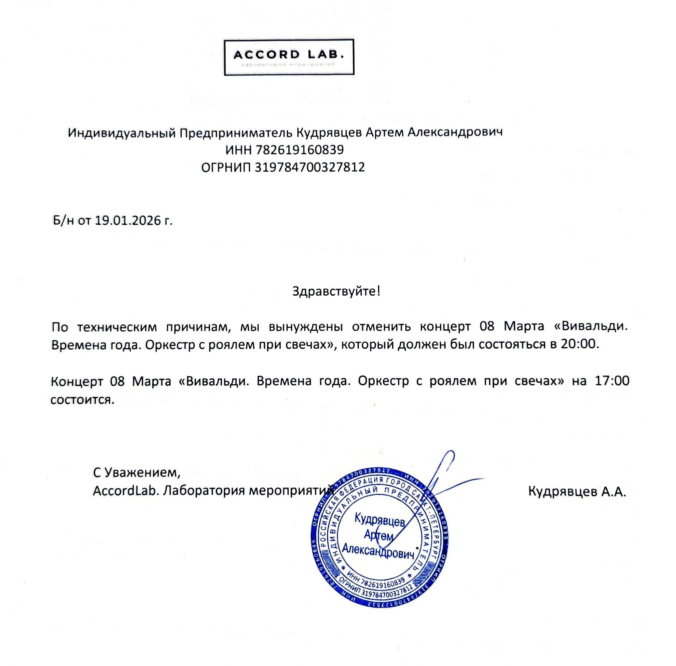 Спешим сообщить, что по информации, полученной от организатора, концерт «Вивальди. Времена года. Оркестр с роялем при свечах», запланированный на 8 марта 2026 года в 20:00 в Киноконцертном зале «Эльдар», отменён.