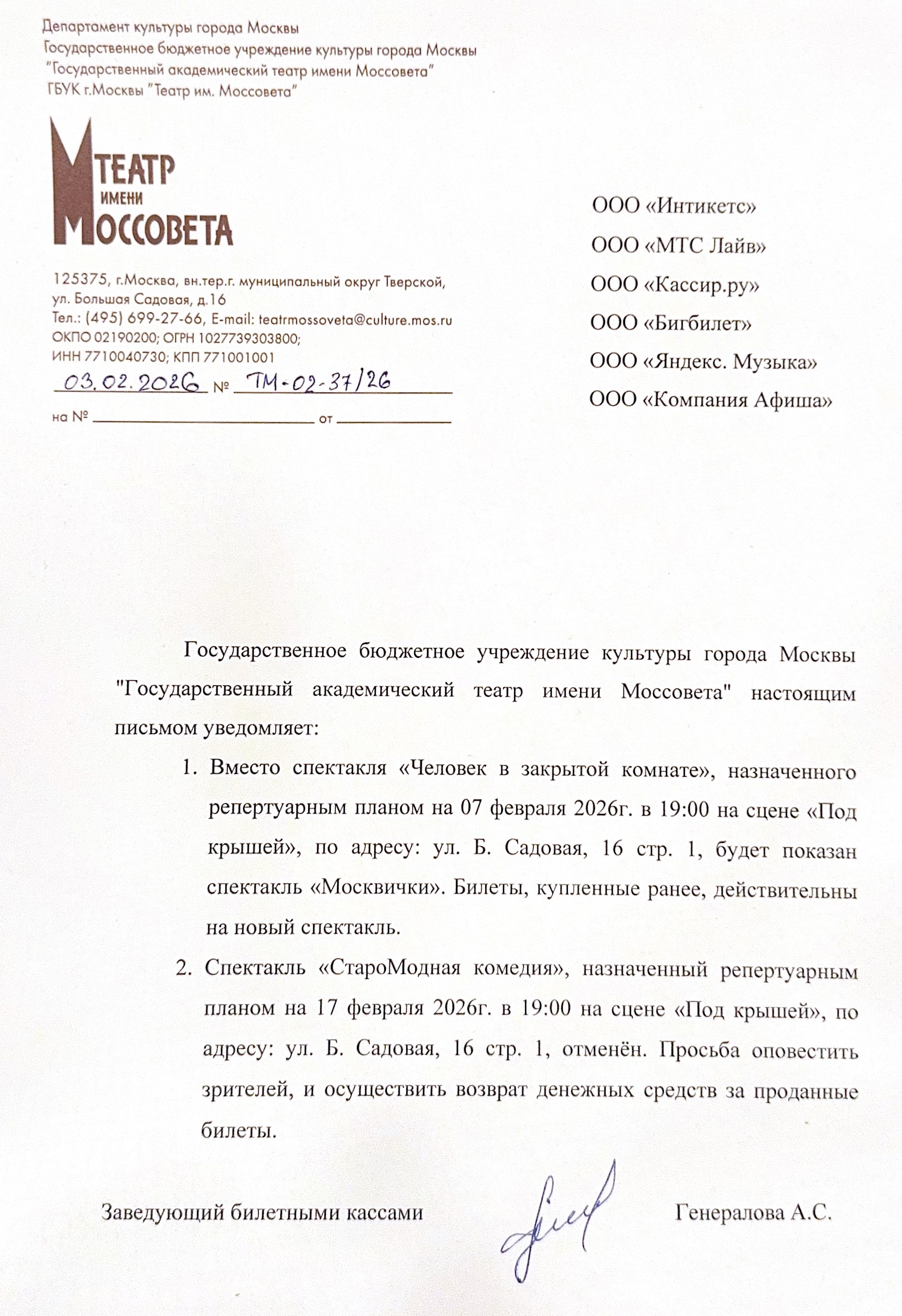 Спешим сообщить, что по информации, полученной от организатора, спектакль «Человек в закрытой комнате», запланированный на 7 февраля 2026 года в 19:00 в Театре имени Моссовета, заменён на спектакль «Москвички».